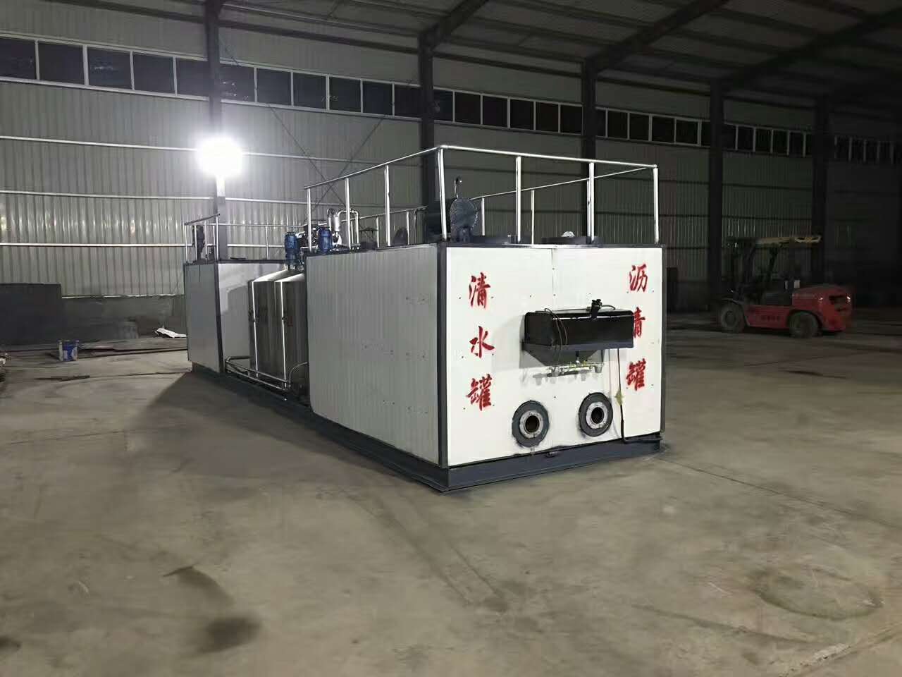 3、打開(kāi)水箱,瀝青中轉(zhuǎn)罐導(dǎo)熱油閥門(mén),加熱水時(shí)注意觀察,瀝青溫度推薦130℃—140℃之間,水溫度在65℃—70℃之間。